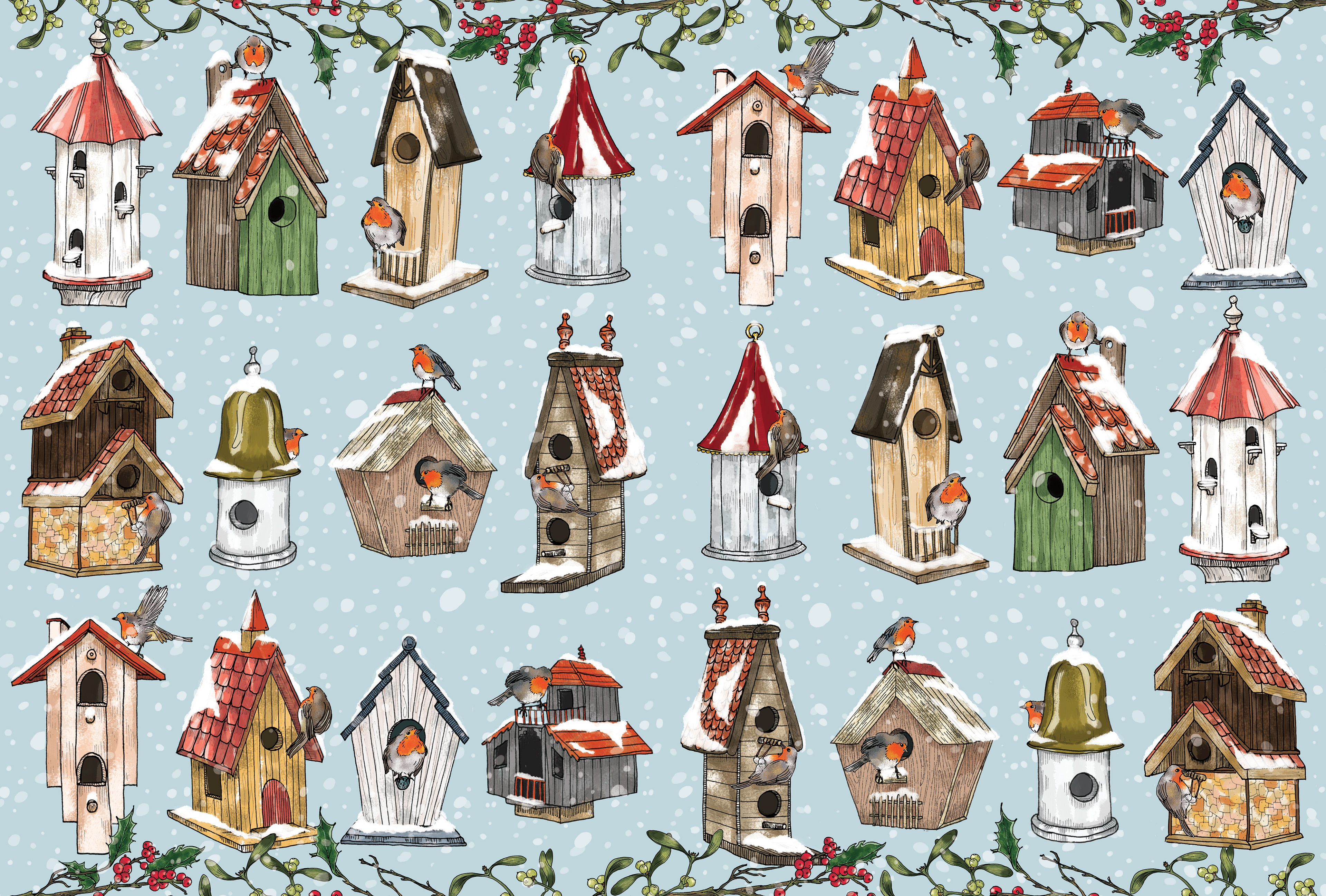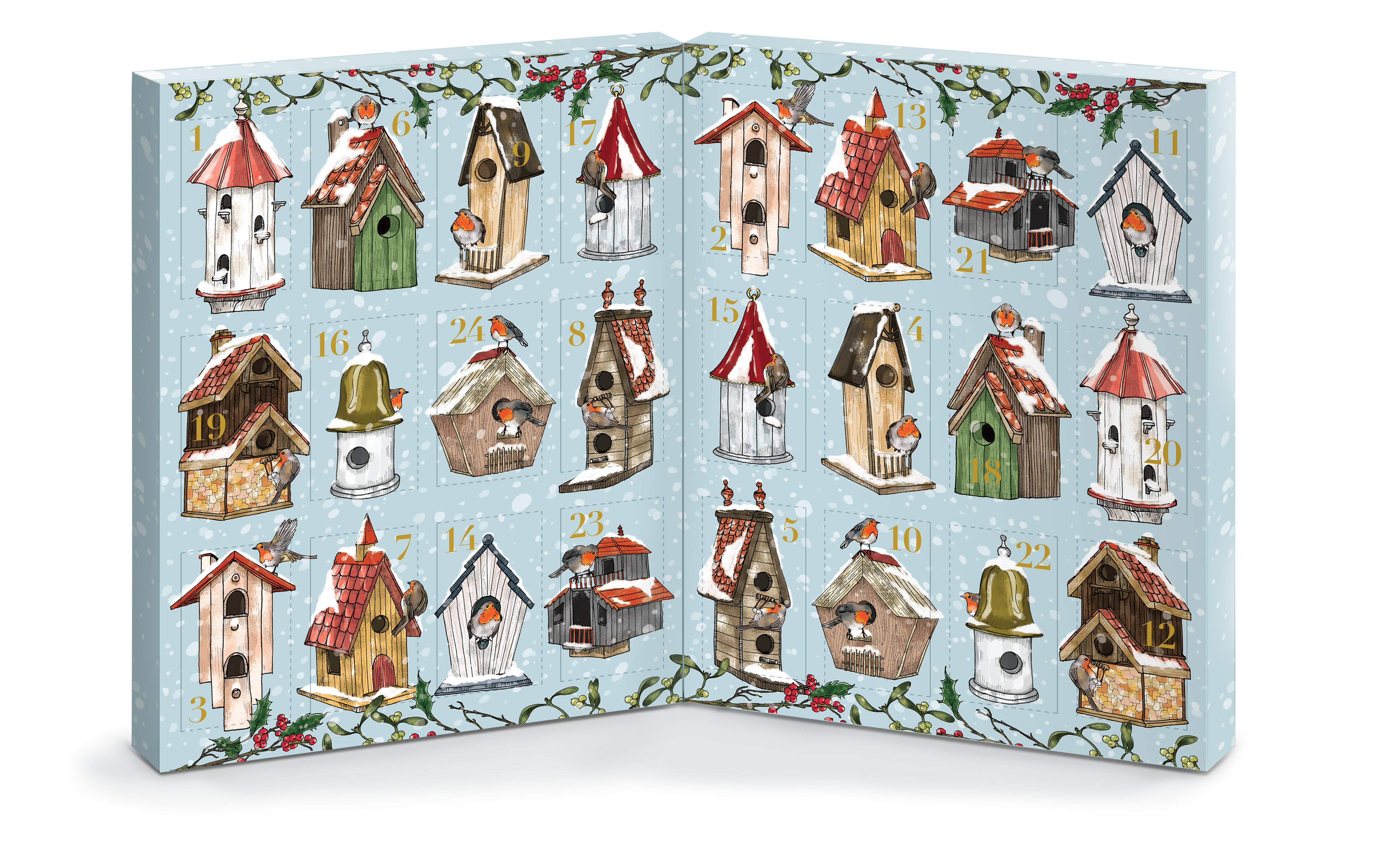 For Betjeman & Barton, creation of a winter Advent calendar where each window reveals a snowy birdhouse with robins.