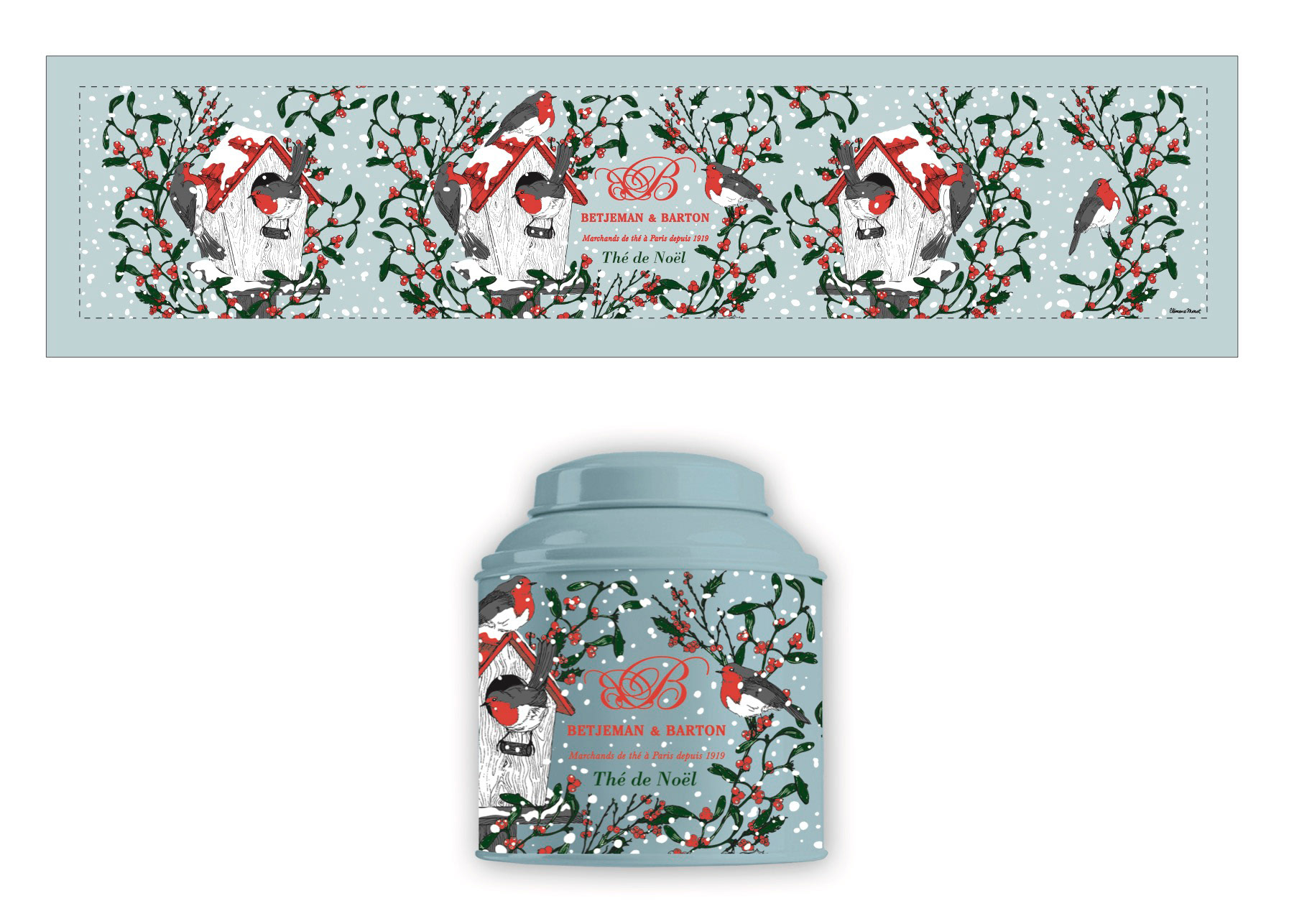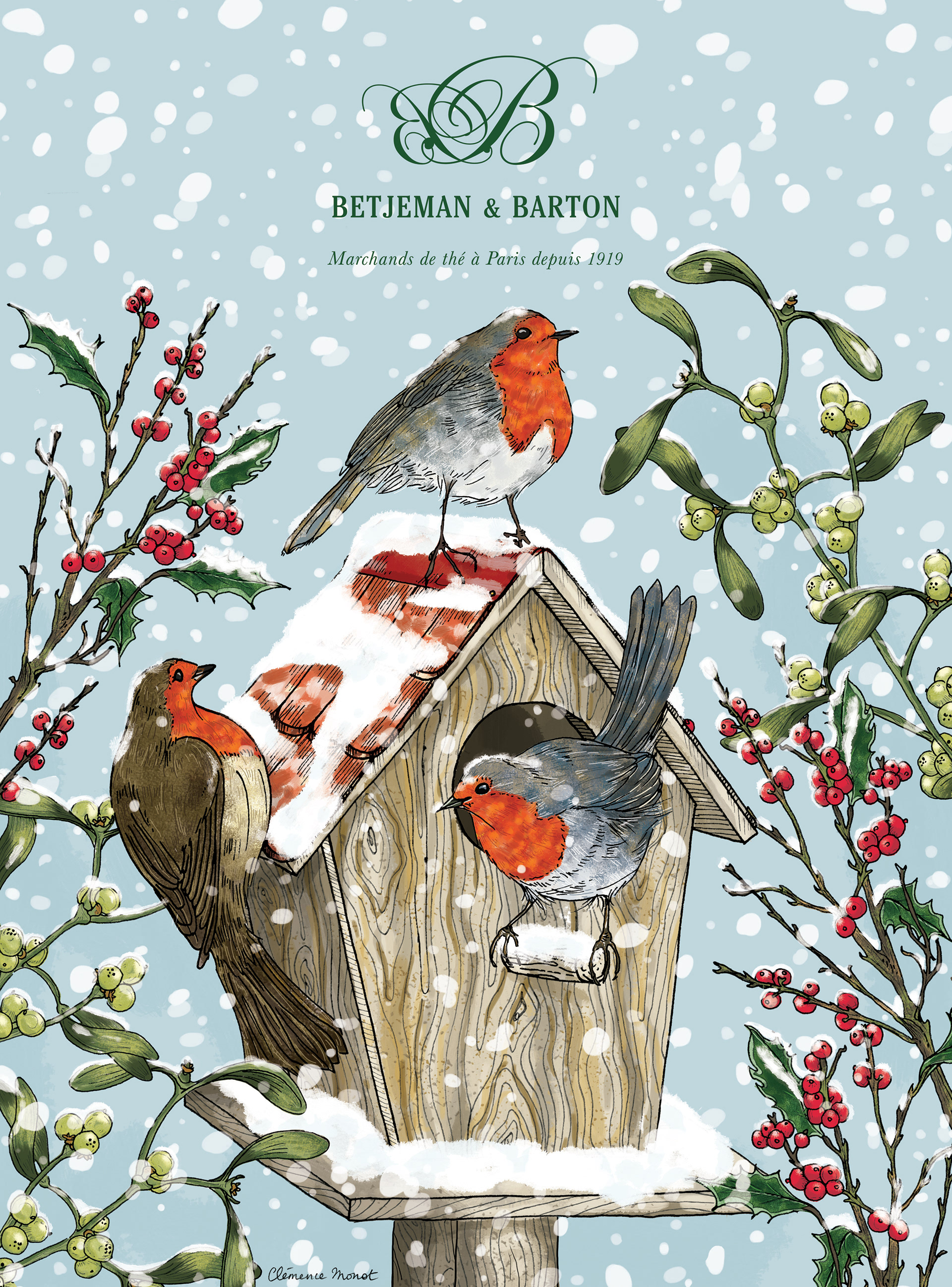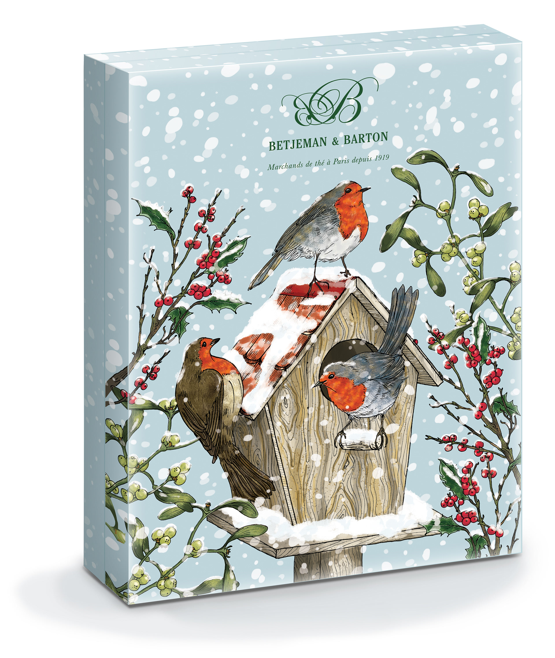 Pour Betjeman & Barton, création d’un calendrier de l’Avent hivernal où chaque case révèle une cabane à oiseaux et ses rouges-gorges sous la neige.