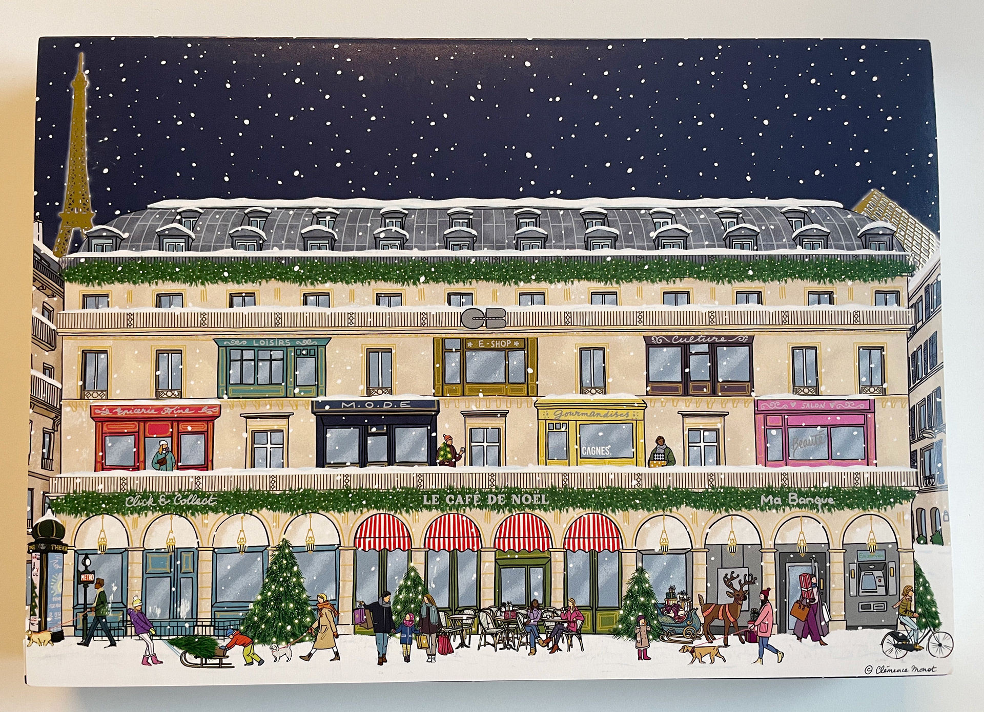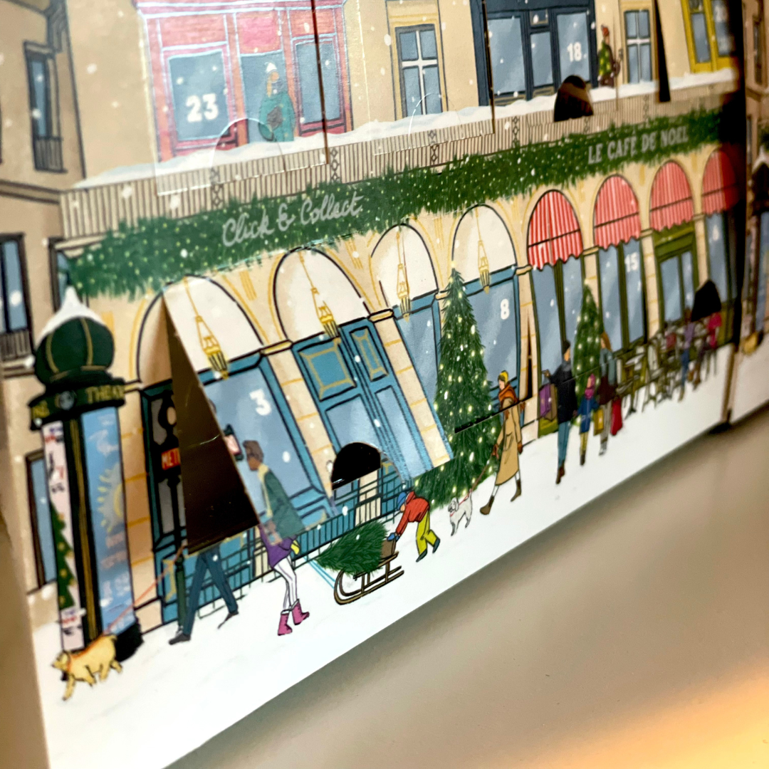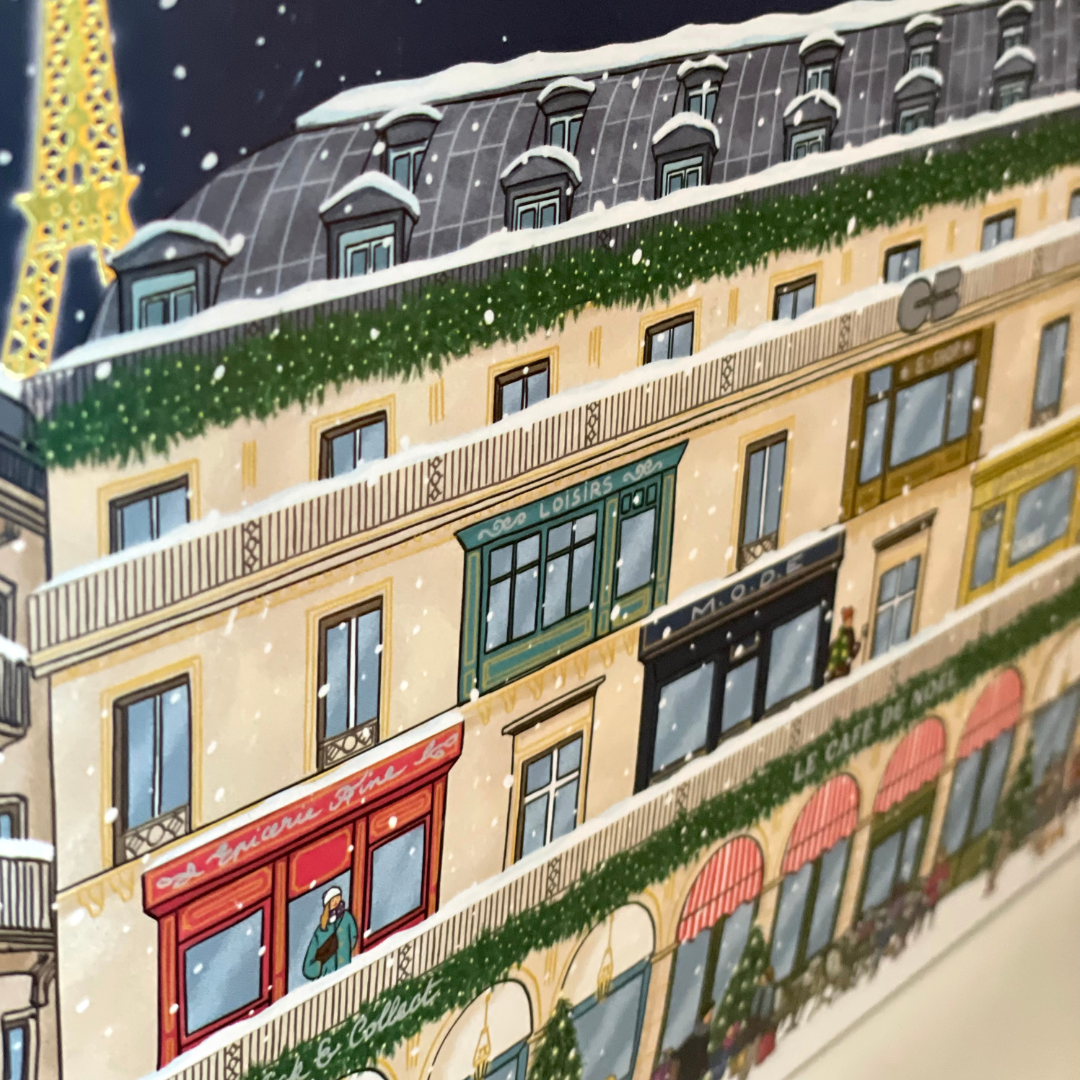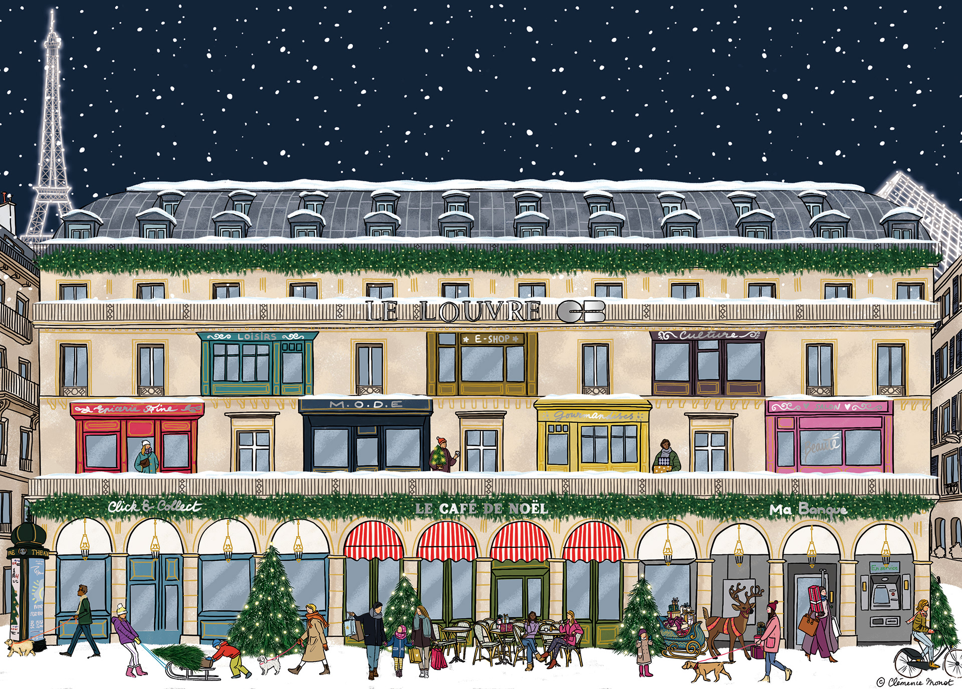For Carte Bancaire, creation of an Advent calendar featuring the Hôtel du Louvre in a magical winter scene with gold foil accents.