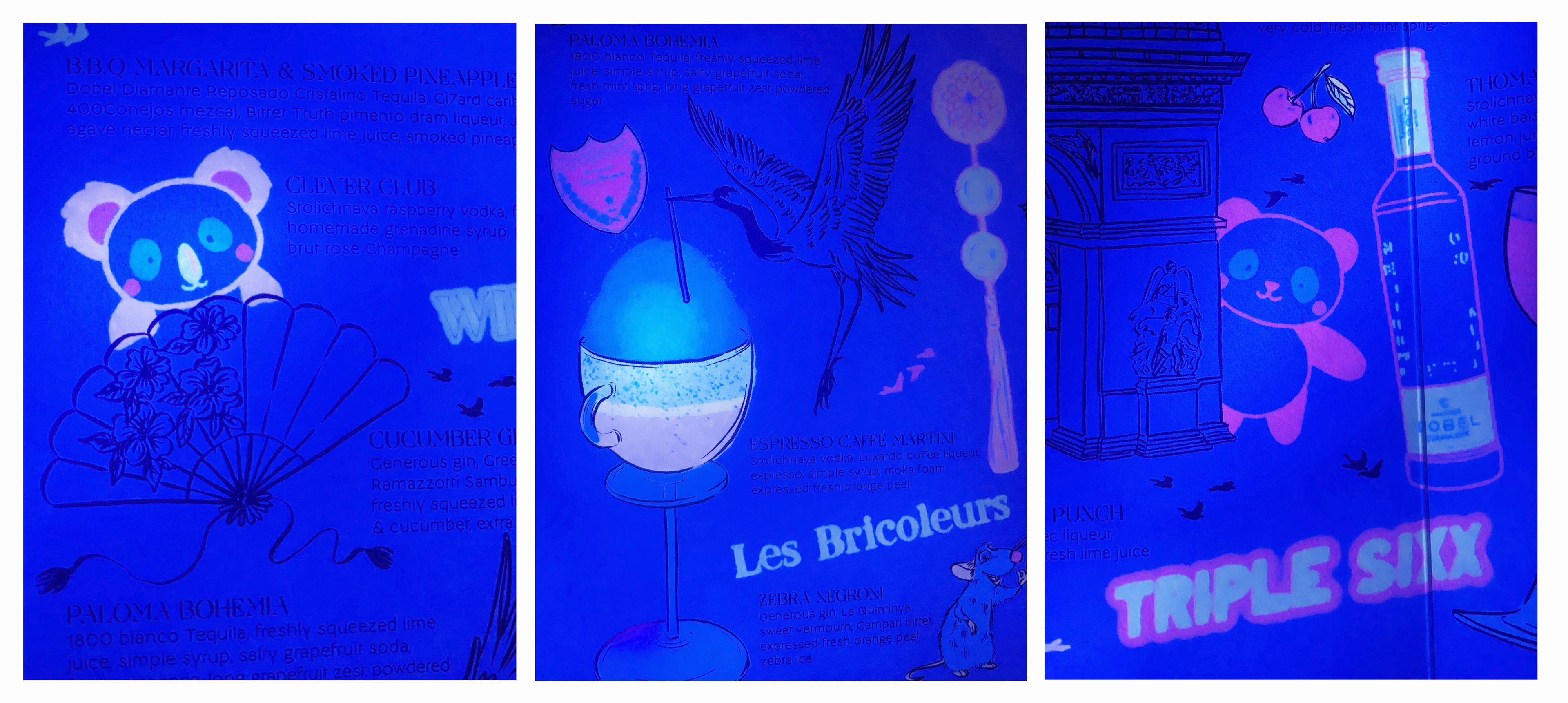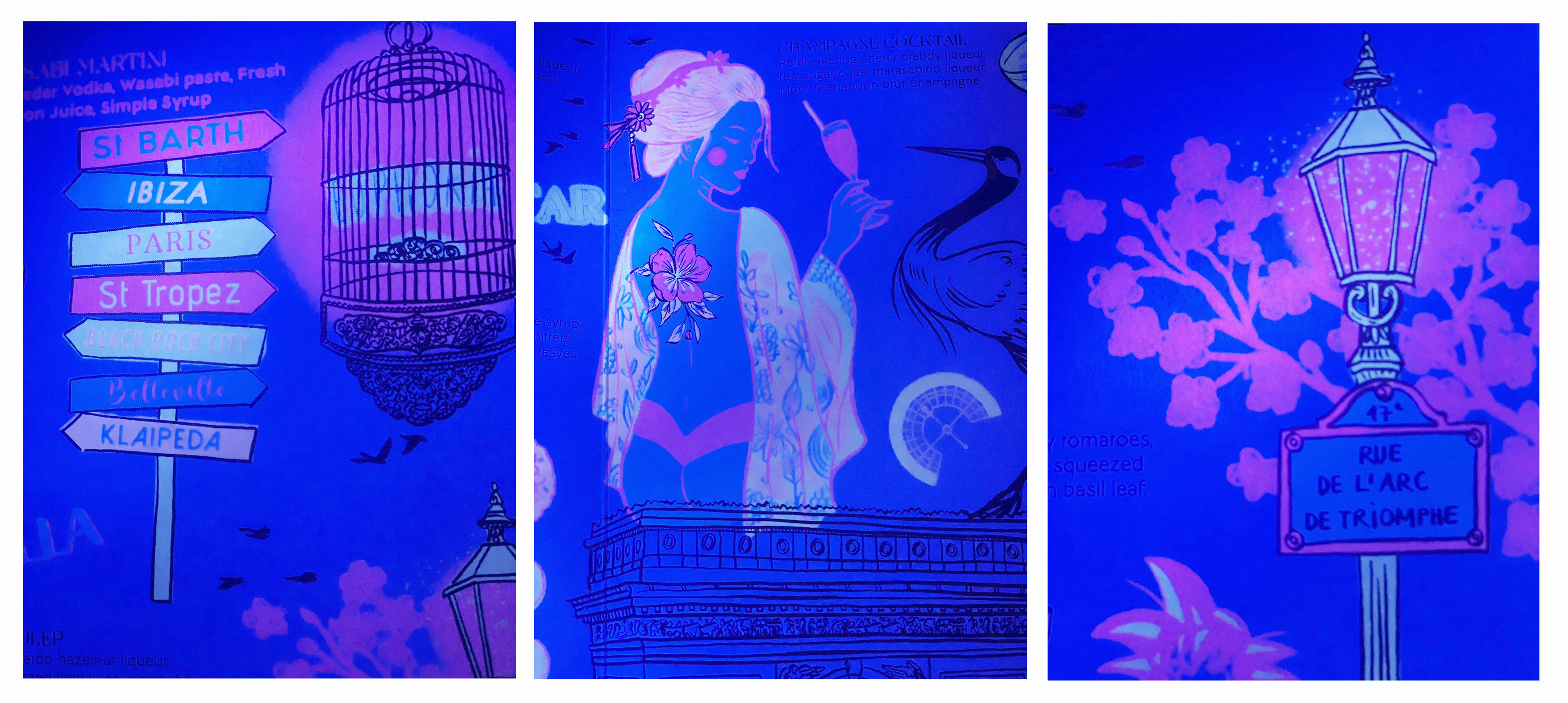 Illustrations fines en noir et blanc, révélant sous lumière noire des dessins aux couleurs éclatantes.