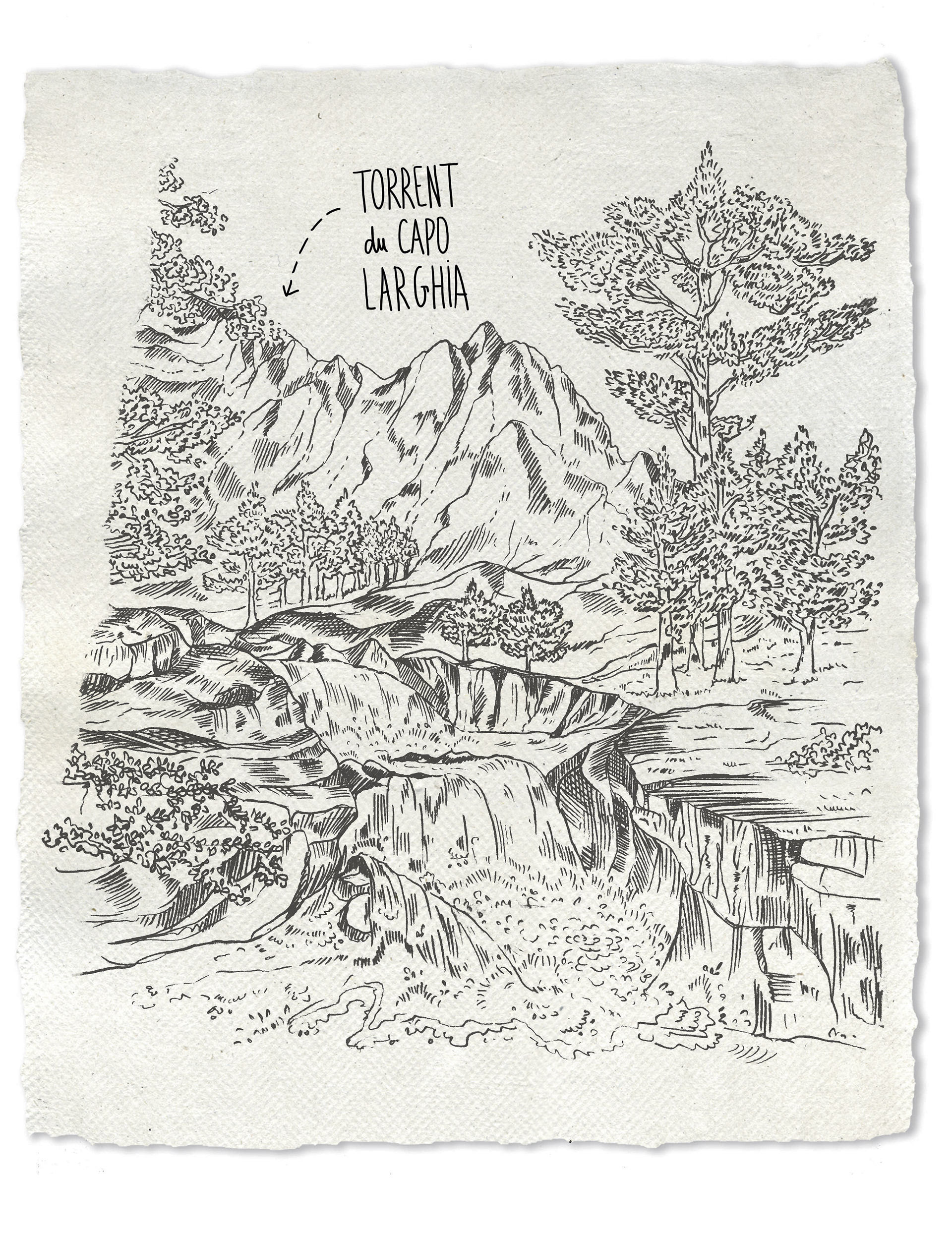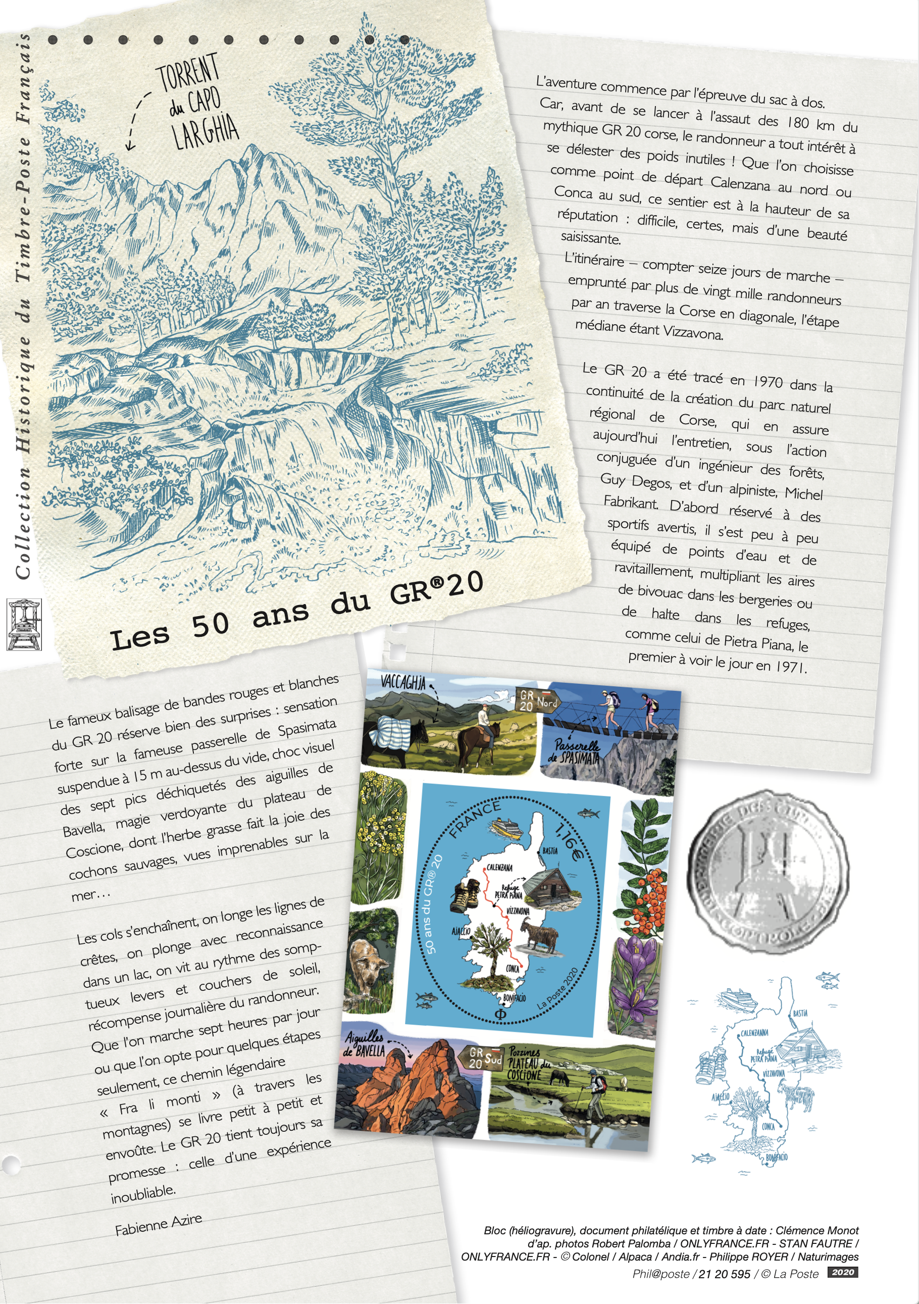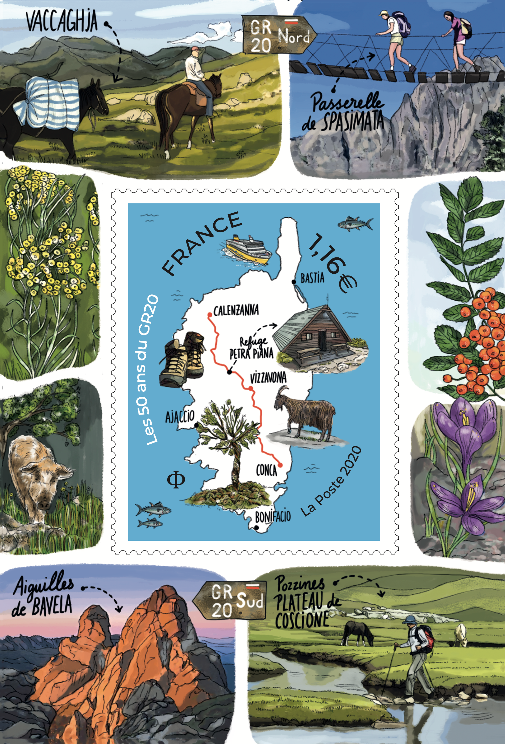 For the GR 20’s 50th anniversary, creation of a collector’s stamp for La Poste, depicting wild Corsican landscapes, ridges, and native vegetation.
