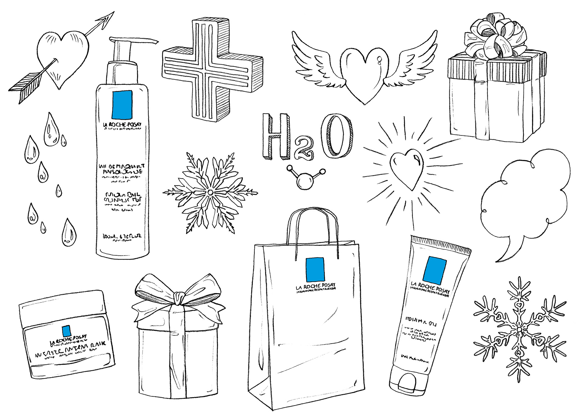 Série d'illustrations au trait pour animer une vidéo publicitaire de la marque La Roche-Posay