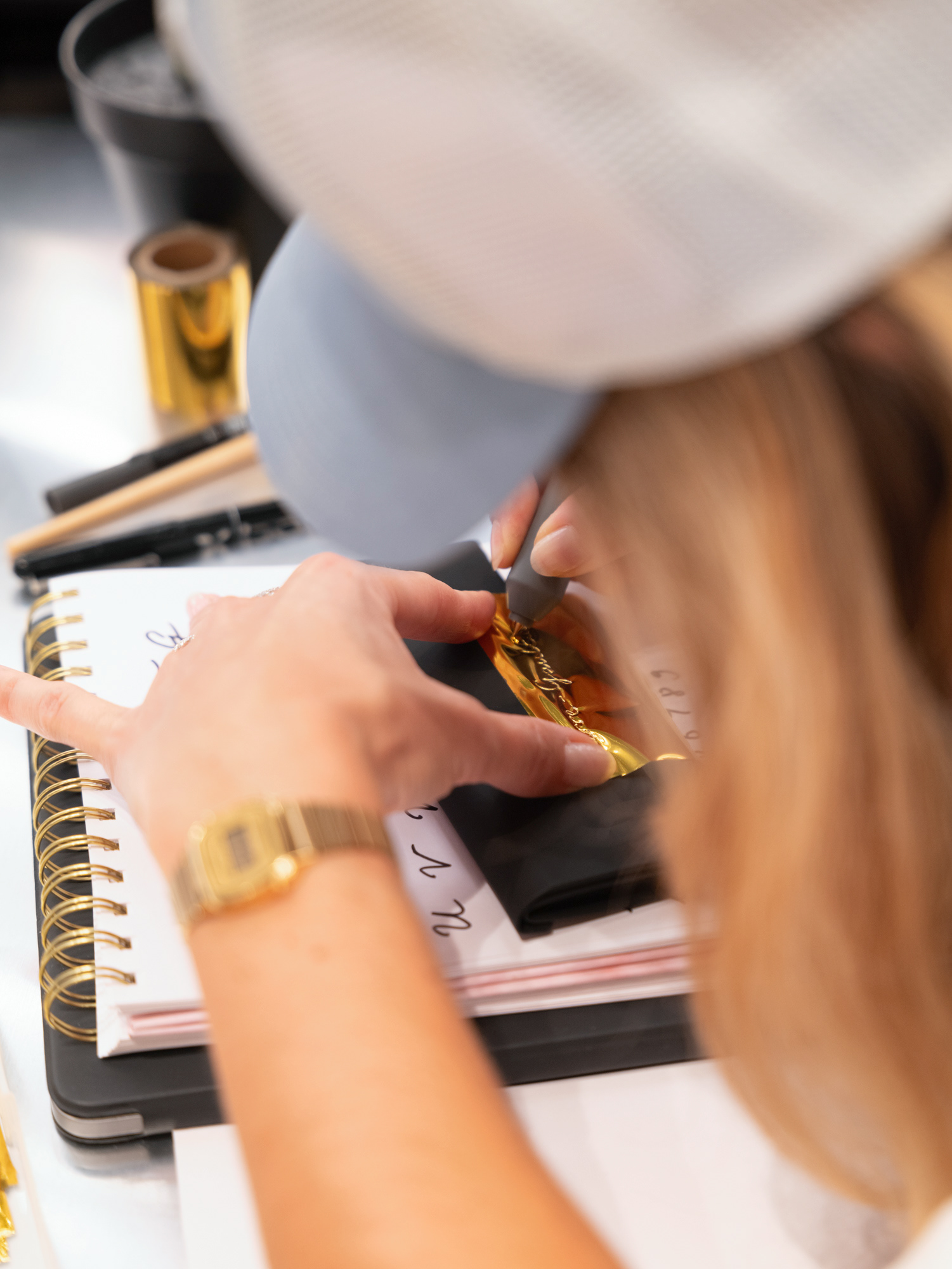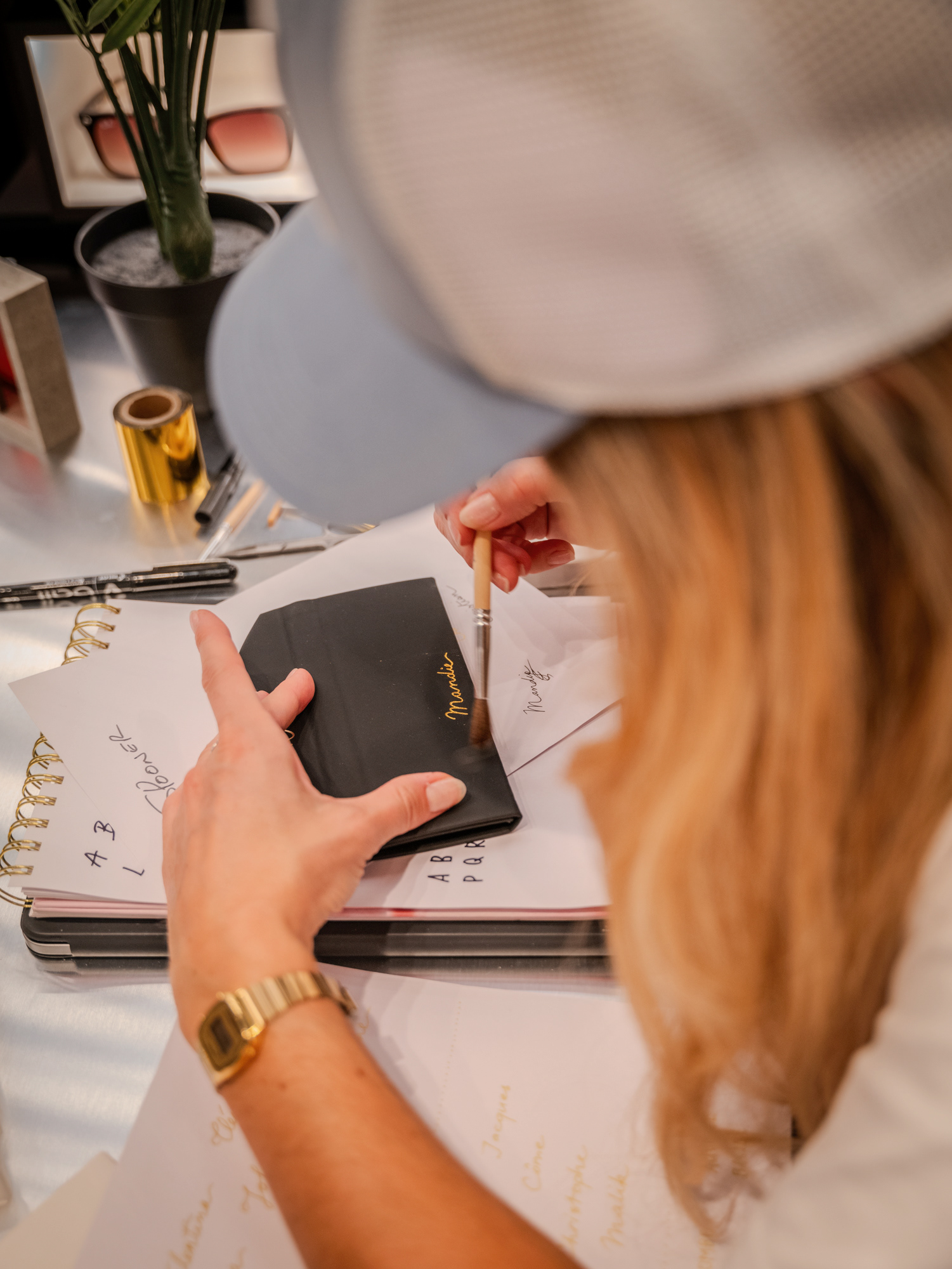 Personalisation of glasses cases with guests’ first names, hand-calligraphed and finished with gold-foil stamping.
