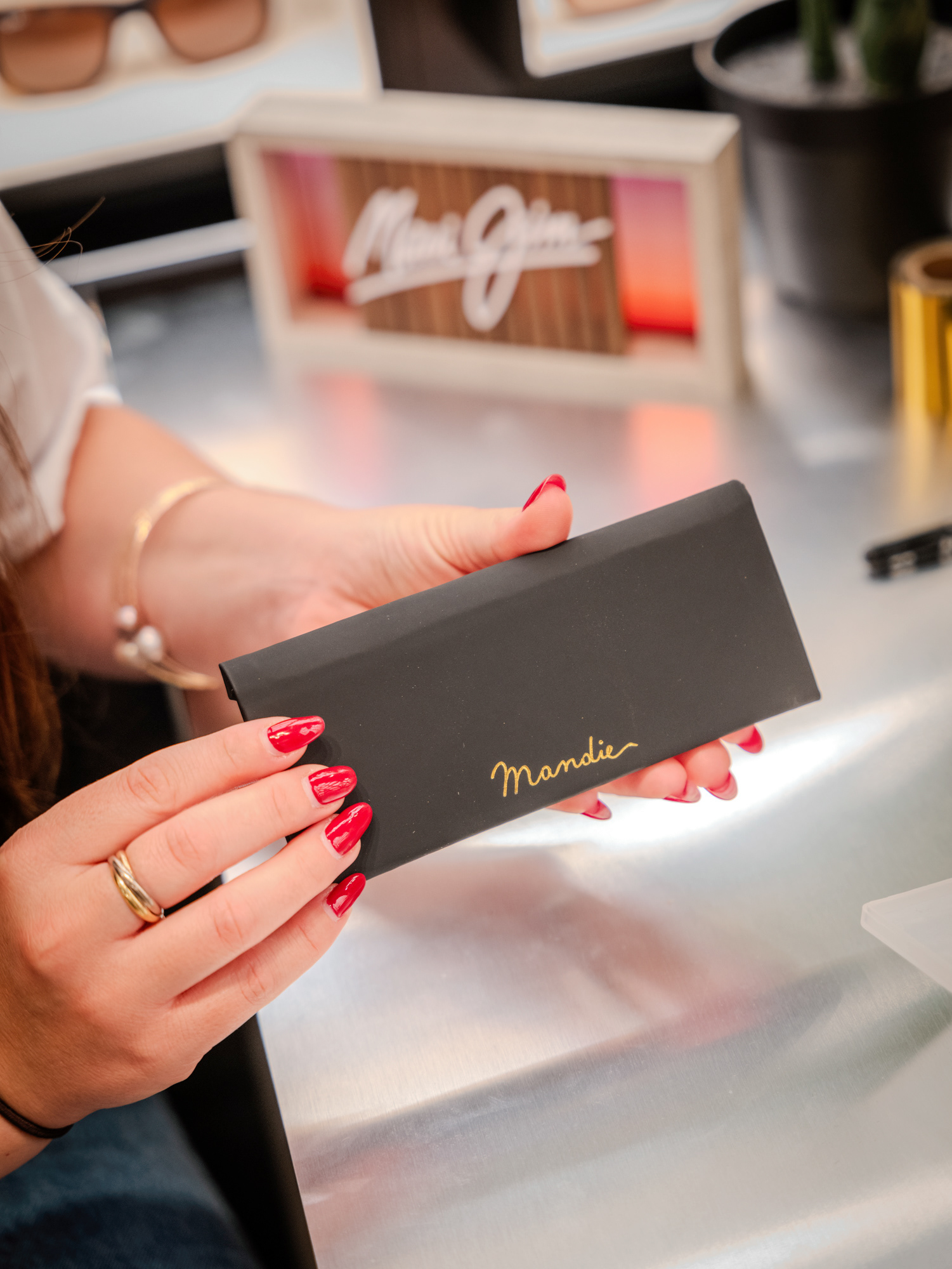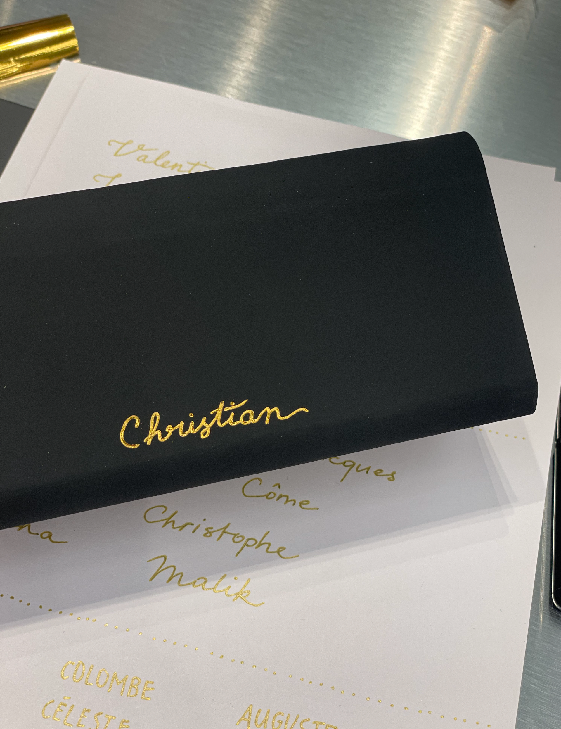 Personnalisation sur les étuis de lunettes, avec le prénom des clients, calligraphié et estampé à la feuille dorée.