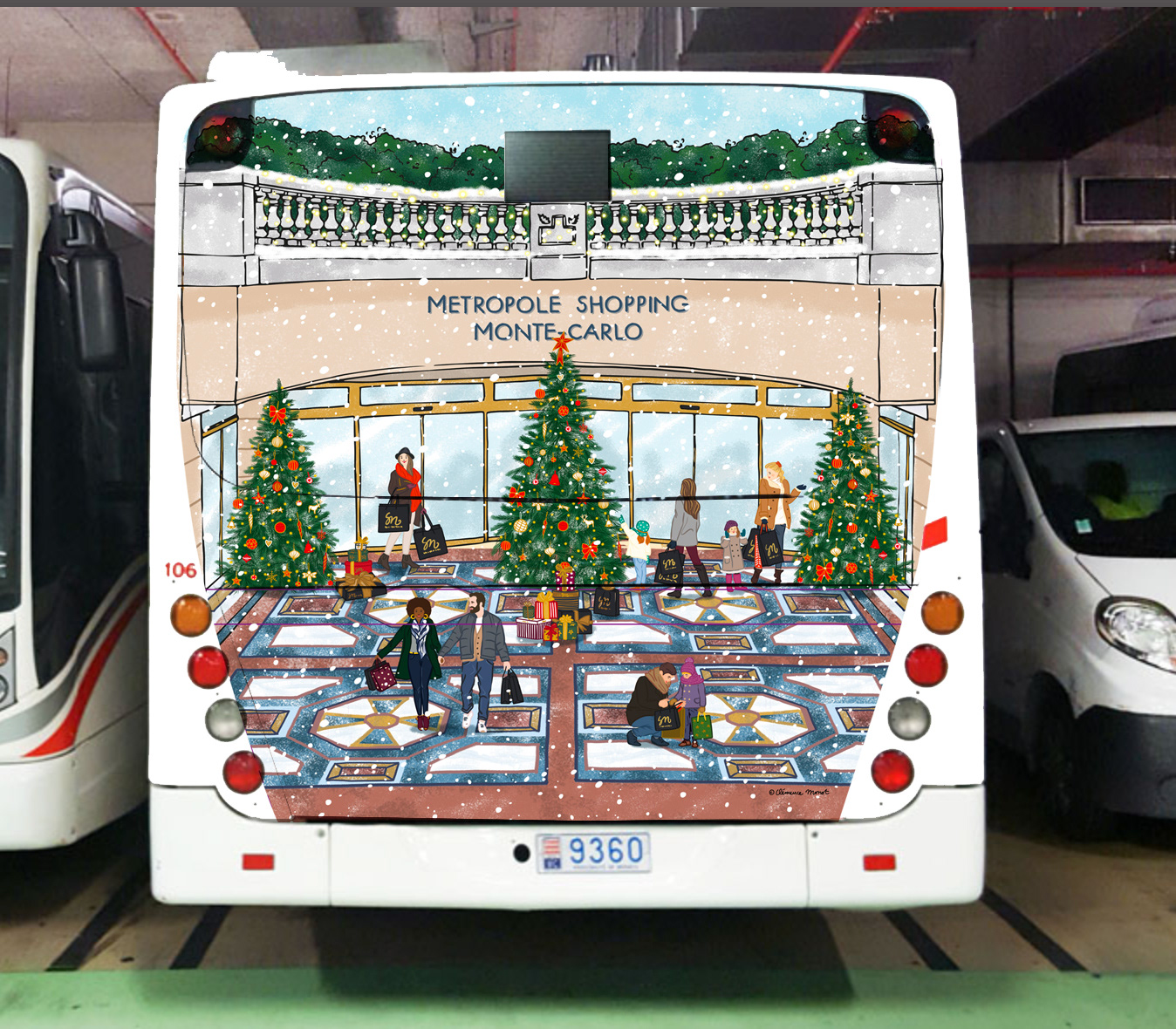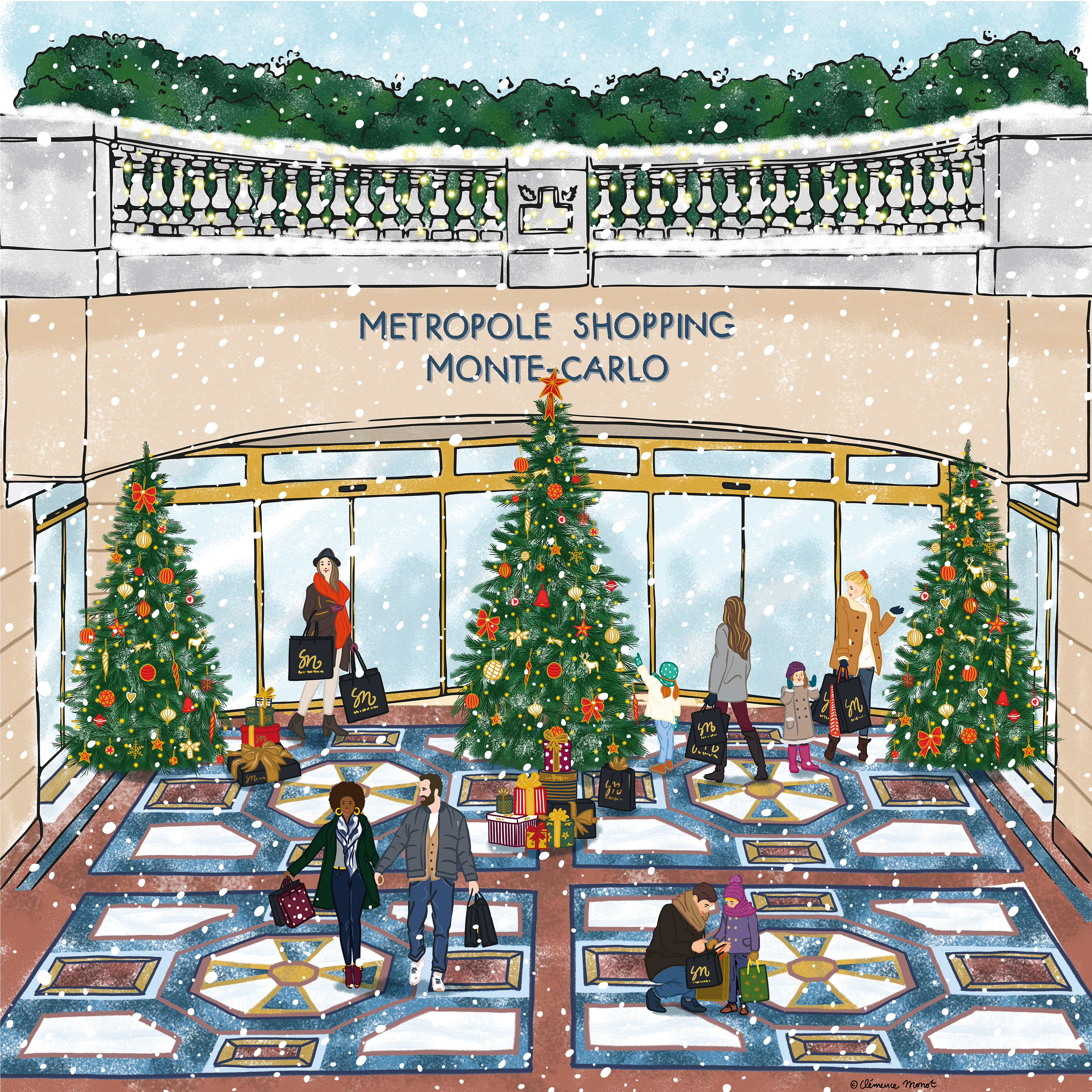 Pour le Métropole Shopping Center à Monaco, création d’une illustration festive habillant toute la devanture pour Noël.