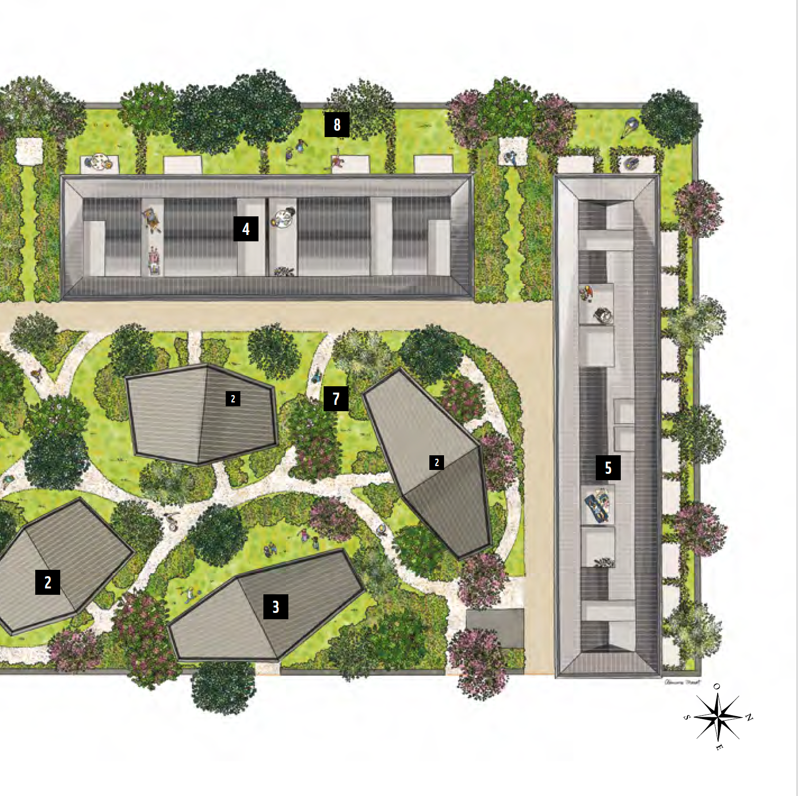 Réalisation pour le magazine OGIC Immobilier d’un plan illustré vue du dessus, représentant une future résidence au cœur d’un parc arboré à Versailles.