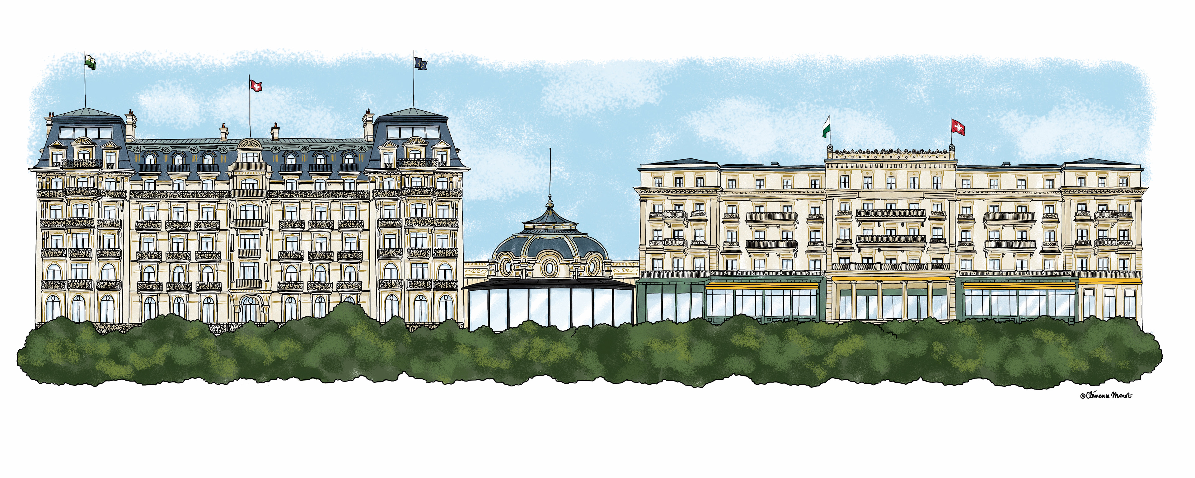 Illustration of the Beau-Rivage Palace in Lausanne, Switzerland.