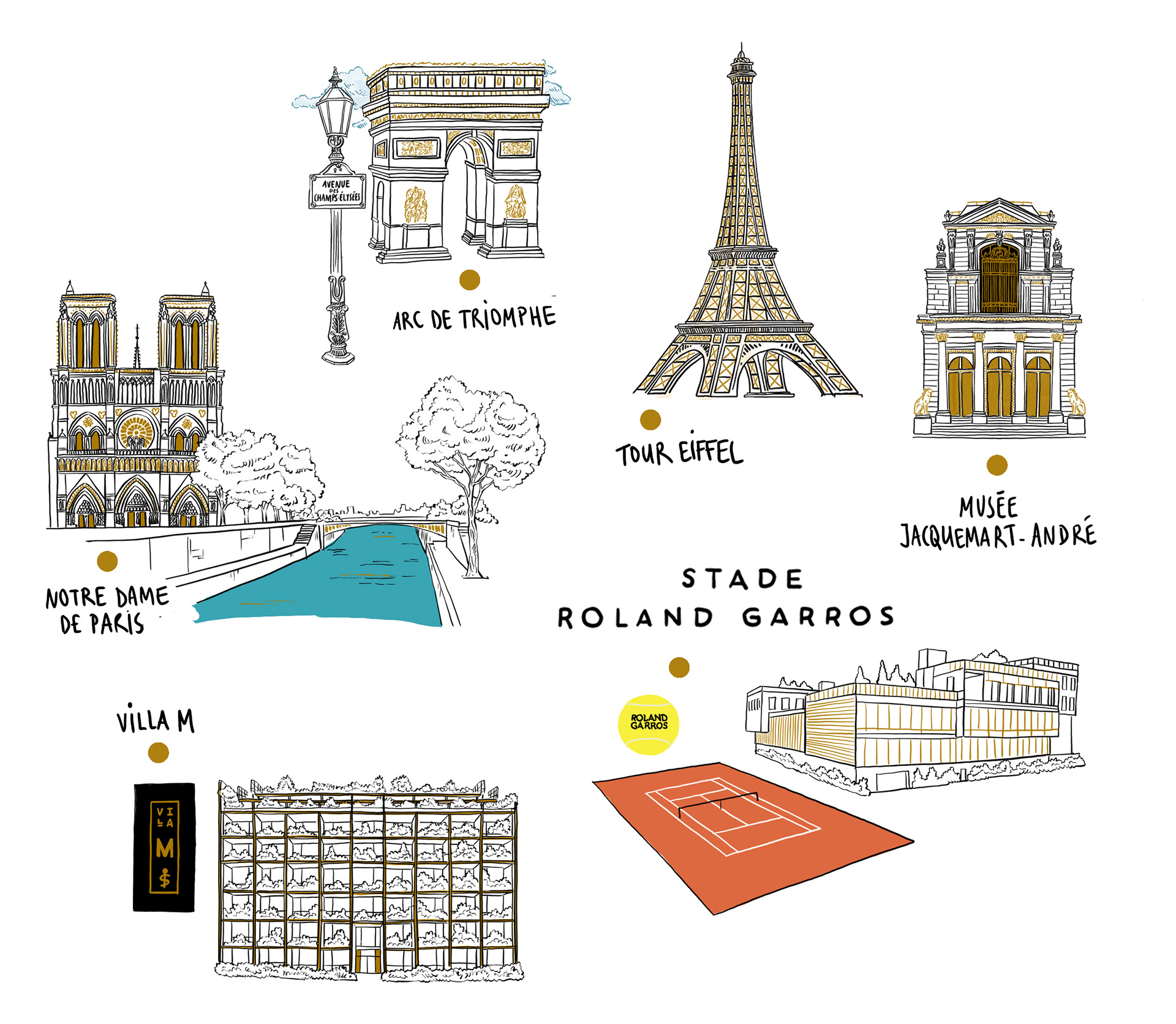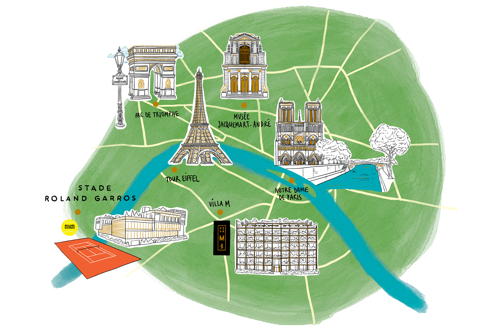For Roland-Garros (with Brightpartnership agency), creation of an illustrated Paris map, printed as postcards for the women’s final.