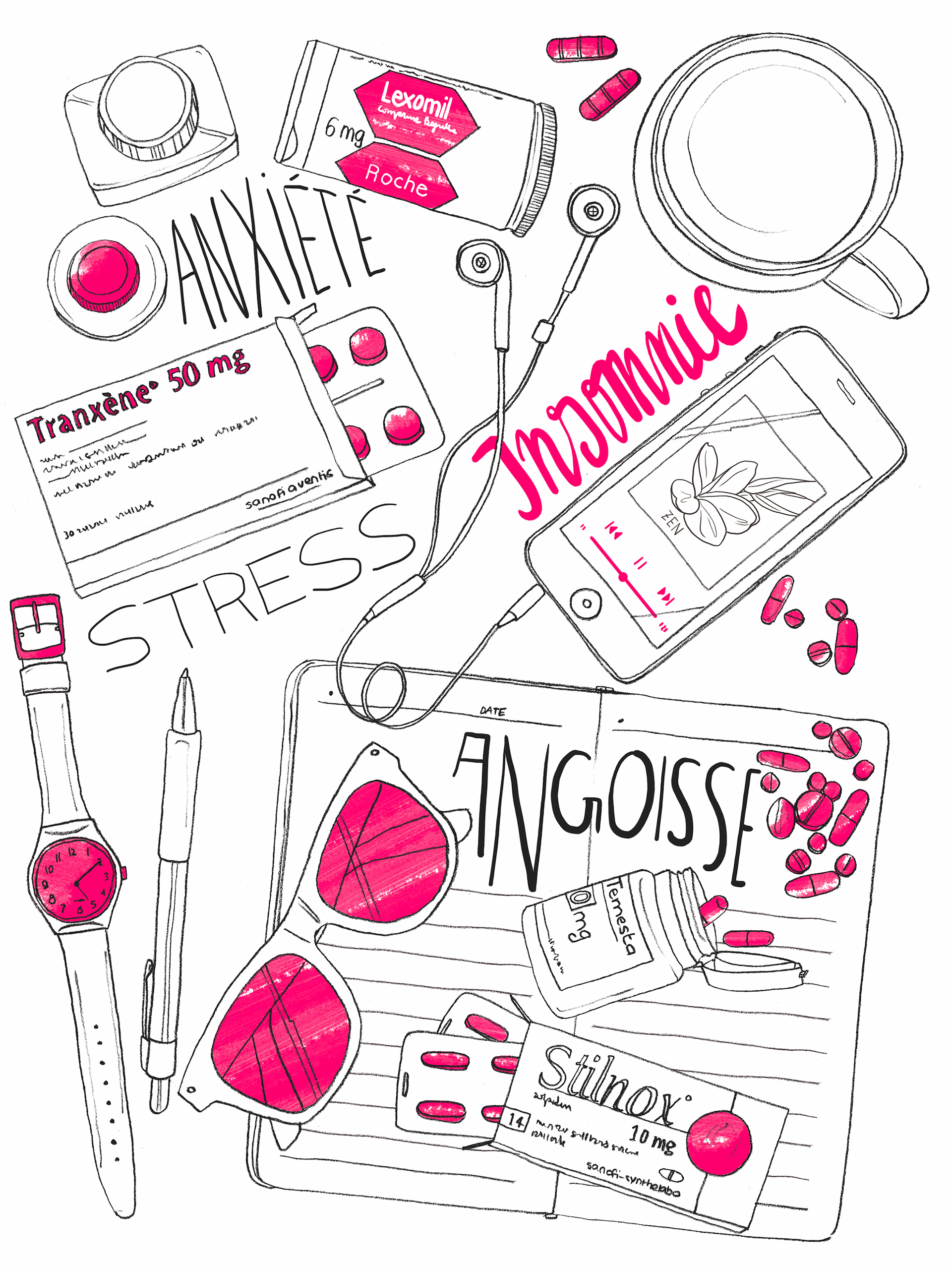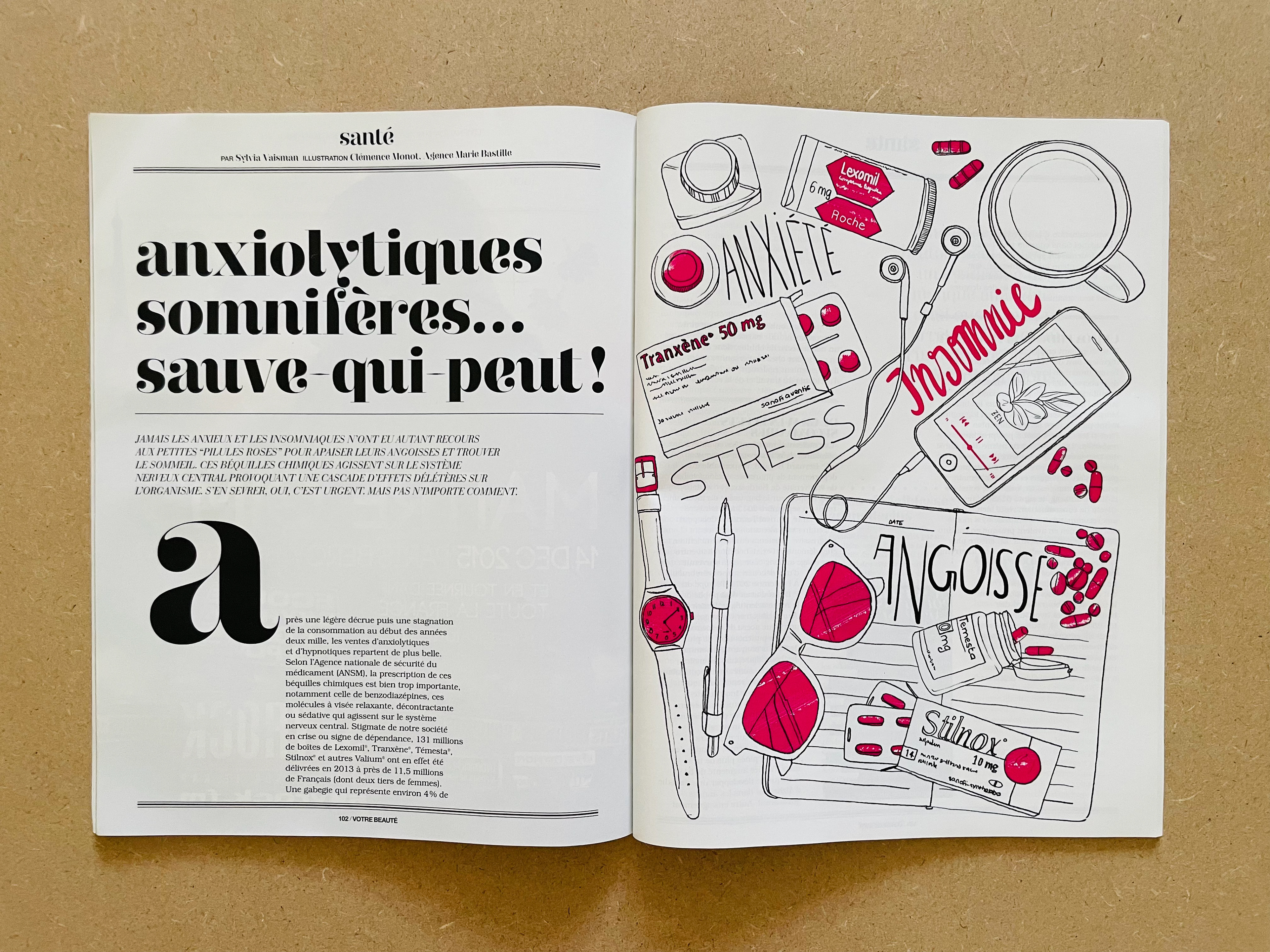 Composition illustrée pour Votre Beauté magazine sur le thème des anxiolytiques